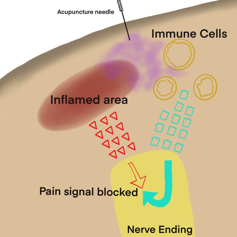 When an acupuncture needle is inserted, the local stimulation and potential release of chemical mediators (like chemokines) can trigger the surrounding immune cells—including macrophages—to release their stored endogenous opioids locally, contributing to pain relief at the site of inflammation. Specifically, electroacupuncture has been shown to regulate chemokines, which in turn lead to an increase in opioid-containing macrophages at the inflamed site.